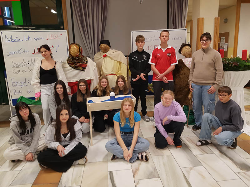 Schüler*innen der 1EF haben im Kreativunterricht lebensgroße Krippenfiguren, Sterne aus alten Kleiderbügeln und Papier gestaltet, Plakate gezeichnet und den Christbaum geschmückt. Damit sorgten sie für ein stimmungsvolles Ambiente bei der Adventfeier am 28.11.2025. Vielen Dank an Brigitte Sandmann und Boriana Karapenteva-Strasser, die ihre Künstler*innen mit soviel Geduld begleitet und deren Eigenständigkeit gefordert haben.